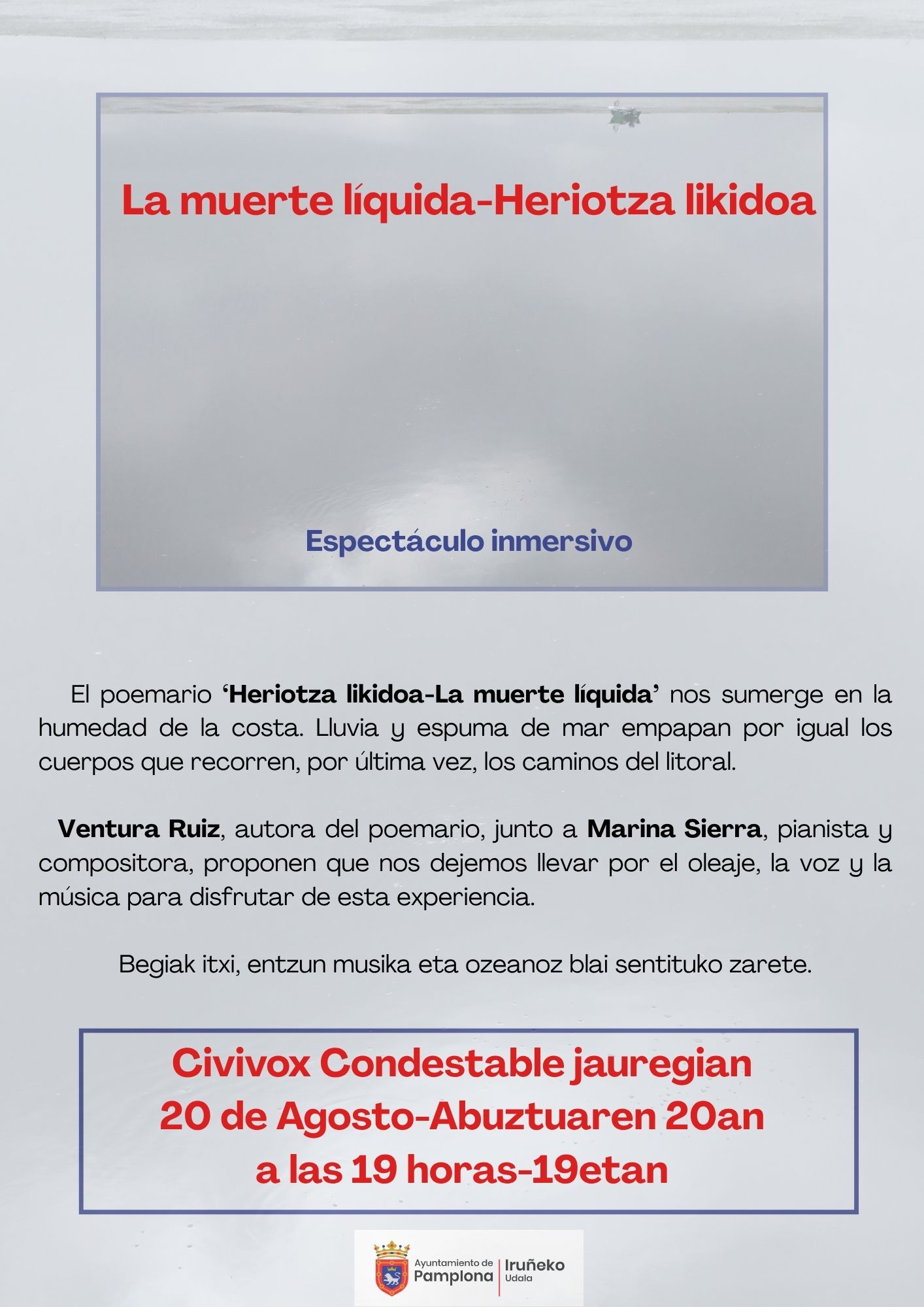 El poemario “Heriotza likidoa-La muerte líquida” nos sumerge en la humedad de la costa. Lluvia y espuma de mar empapan por igual los cuerpos que recorren, por última vez, los caminos del litoral.