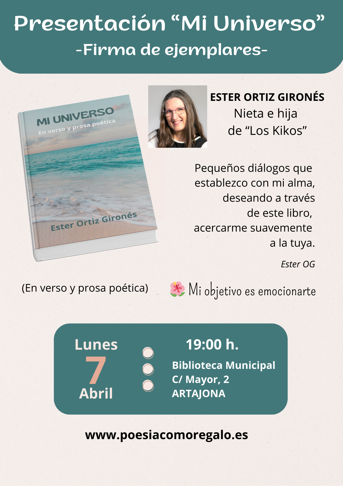 Ester Ortiz Gironés presenta su primer poemario “Mi universo” en la Biblioteca de Artajona, pueblo de su padre, y conocida la familia como “Los Kikos”.