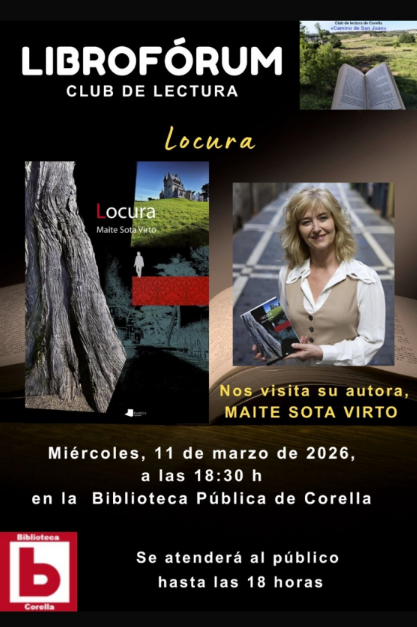El Club de lectura Libroforum acogerá a la autora Maite Sota para hablar de su novela Locura en la biblioteca pública de Corella el día 11 de marzo.
