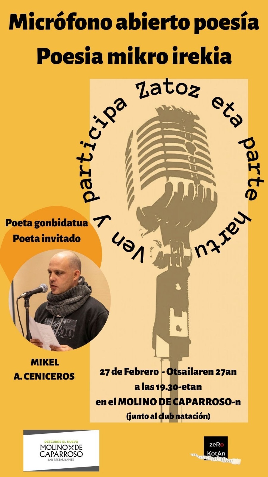 El viernes 27 de febrero a las 19.30 h en el bar restaurante Molino de Caparroso se celebra el micrófono abierto de poesía organizado por la asociación Zerokotan donde todo el que lo desee podrá recitar sus versos.